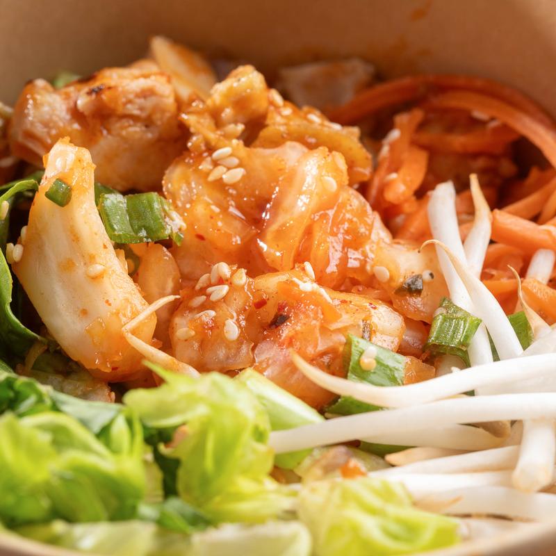 Korean Style Chicken with Kimchi, Shredded Carrots, Cucumber, Green Onion, Romaine Lettuce, Bean Sprouts and Sesame Seeds