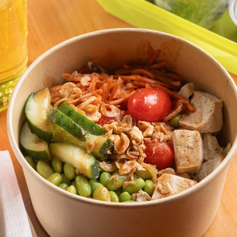 Baked Tofu, Edamame, Picked Radish and Carrot, Romaine Lettuce, Crispy Shallots and Crushed Peanuts