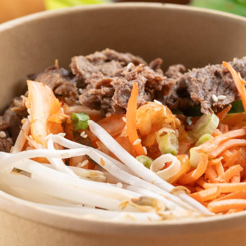 Korean style Beef with Kimchi, Shredded Carrots, Cucumber, Green Onion, Romaine Lettuce, Bean Sprouts, Sesame Seeds.