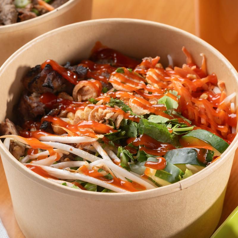 Vietnamese-style charred BBQ pork with Romaine Lettuce, Bean Sprouts, Cucumbers, Pickled Radish & Carrot, Cilantro, Crushed Peanuts and Crispy Shallots.